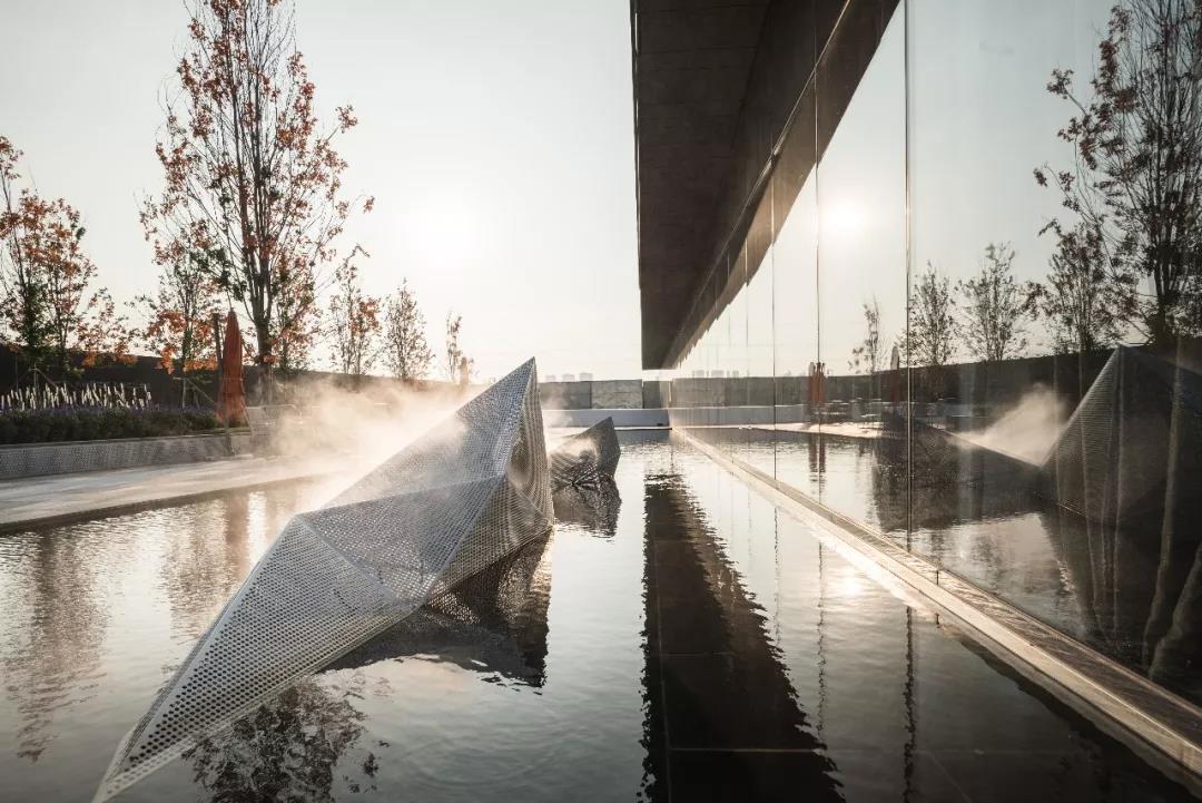 夕陽西下,漫步在這“城市印記?藝術(shù)館”,看余暉灑滿微波蕩漾的水面,靜謐而恬適。蘆葦燈亮起,異形穿孔設(shè)計(jì)打造的種植池空間,顯得清透又澄澈。水景雕塑,形態(tài)各異的錯(cuò)落,極富藝術(shù)質(zhì)感。臨水設(shè)置了陽傘座椅,讓人可駐足停留,悠閑休憩。