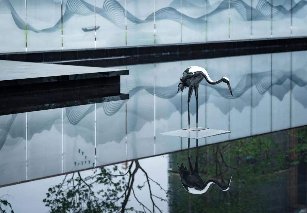大片的水景讓觀者心情平靜,在柔和燈光的配合下,營造出不凡的品味氛圍,水中站立的雕塑作為點睛之筆,讓景色更為靈動。